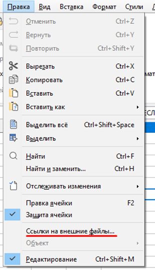 1. В меню Правка нажмите на Ссылки на внешние файлы.
